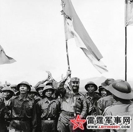 古巴领导人卡斯特罗在Khe Sanh郊外挥舞越南胜利旗,当越南人把美国佬完全赶走后,卡斯特罗还在河内建了一座饭店,在80年代两国关系亲如兄弟。(1973)