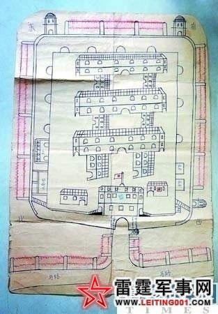 肖老伯手绘的南石头难民收容所图示:①日军办公楼。②刑具房。③医务所。④化骨池。⑤病房(停尸房)。⑥难民宿舍。⑦岗哨。⑧通电铁丝网。⑨