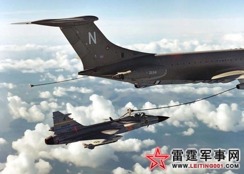 JAS-39接受英军加油机的空中加油,其加油管装在机背上方。